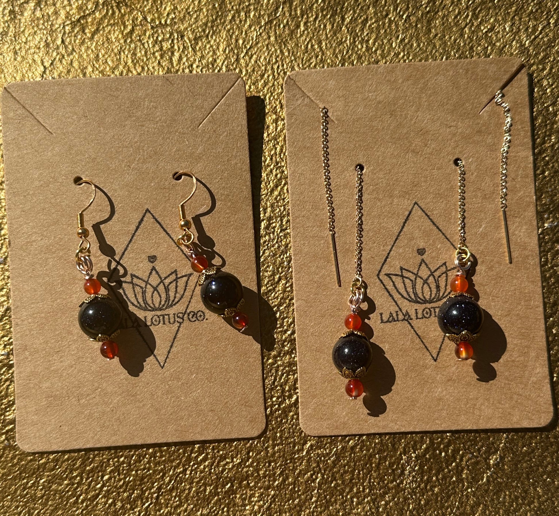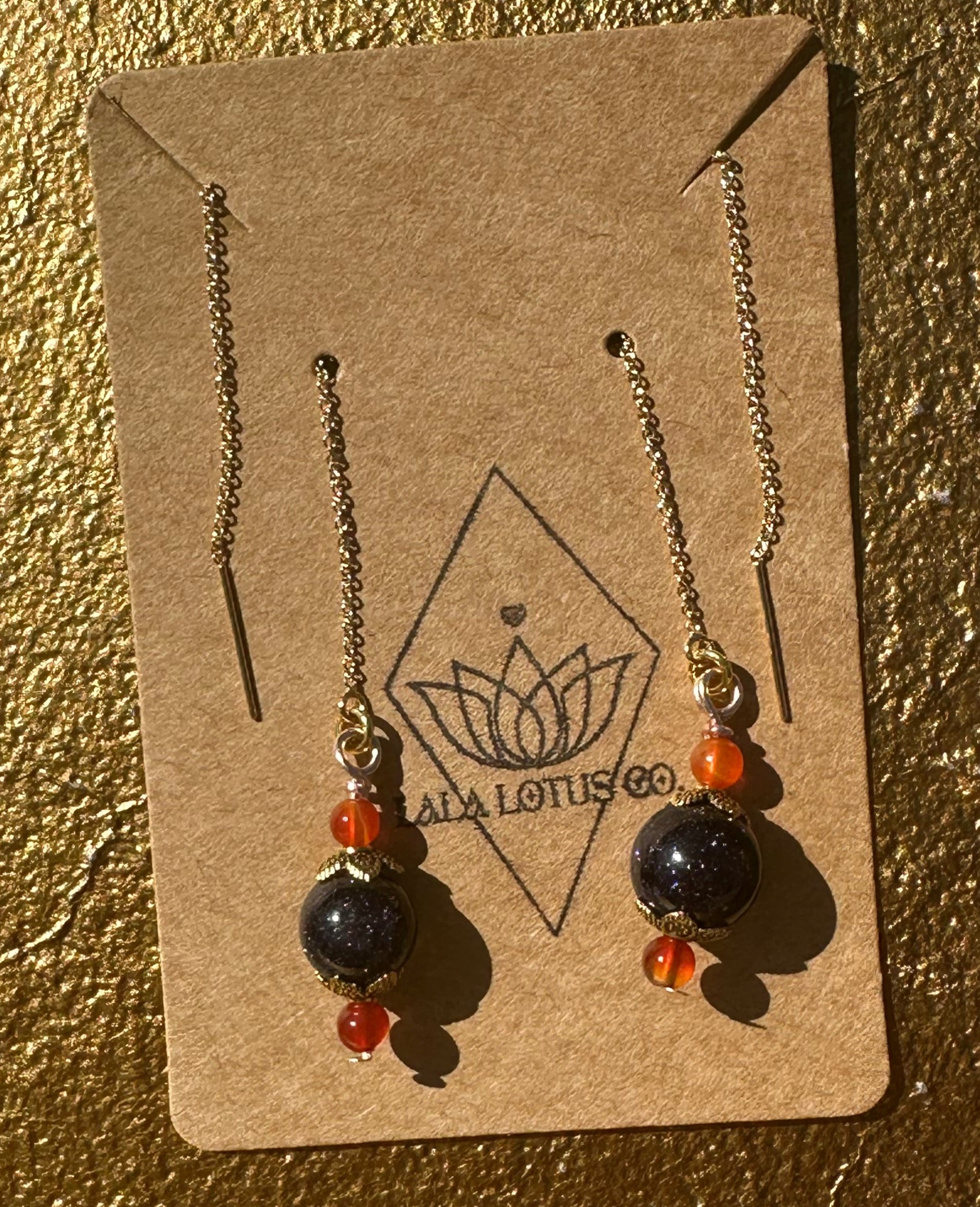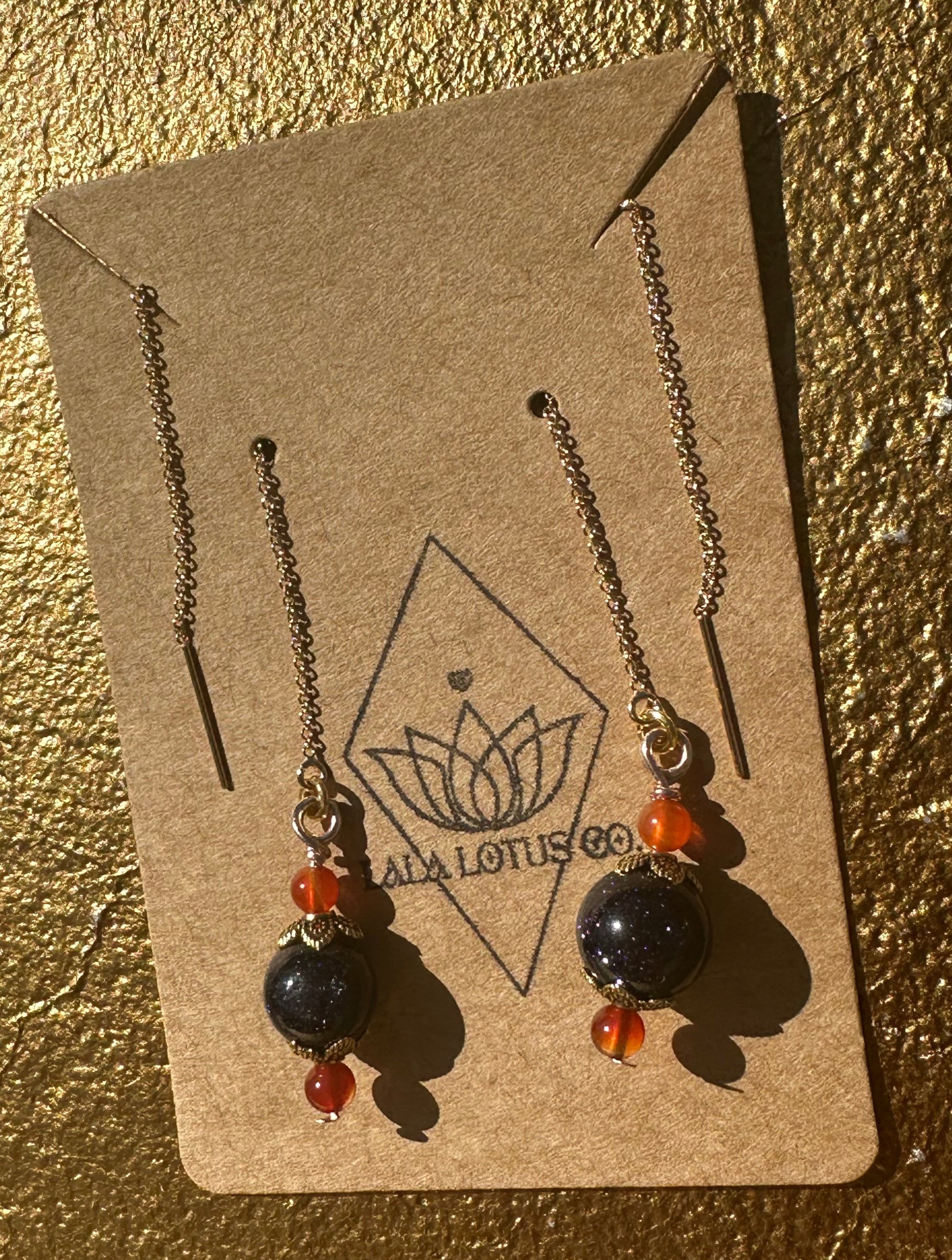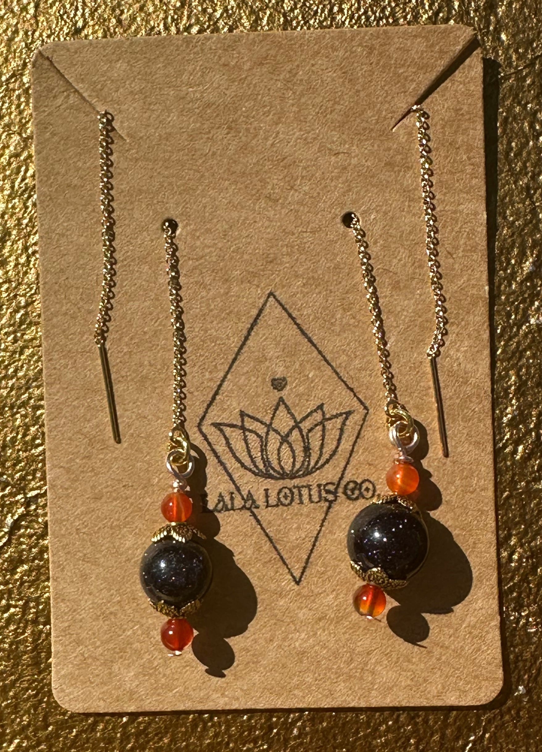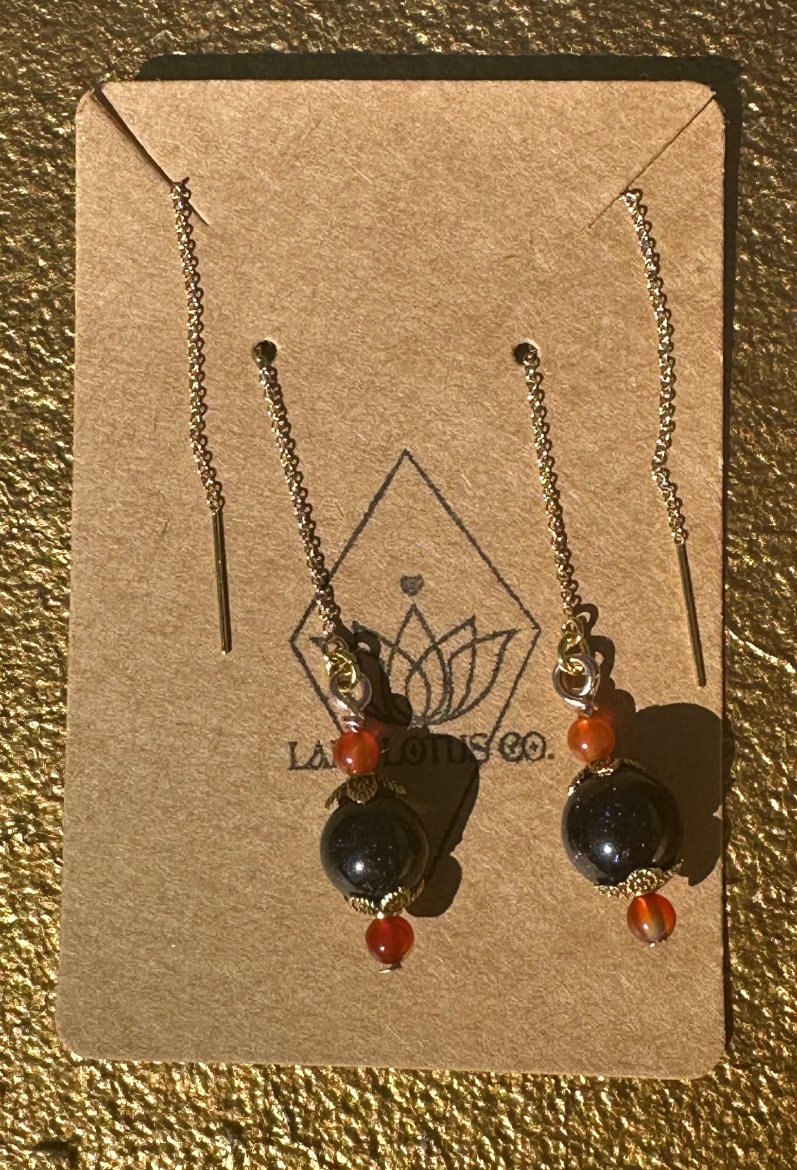 Discover the exquisite Twilight Lantern Earrings, crafted in collaboration with Ghost Guide Rebekah. These stunning earrings are handcrafted and blessed with Reiki, featuring Blue Goldstone and Carnelian designs. Choose between the shorter dangle style (about 1 inch) or the adjustable 4-inch threader design. Note that the longer earrings may feel heavier for some.