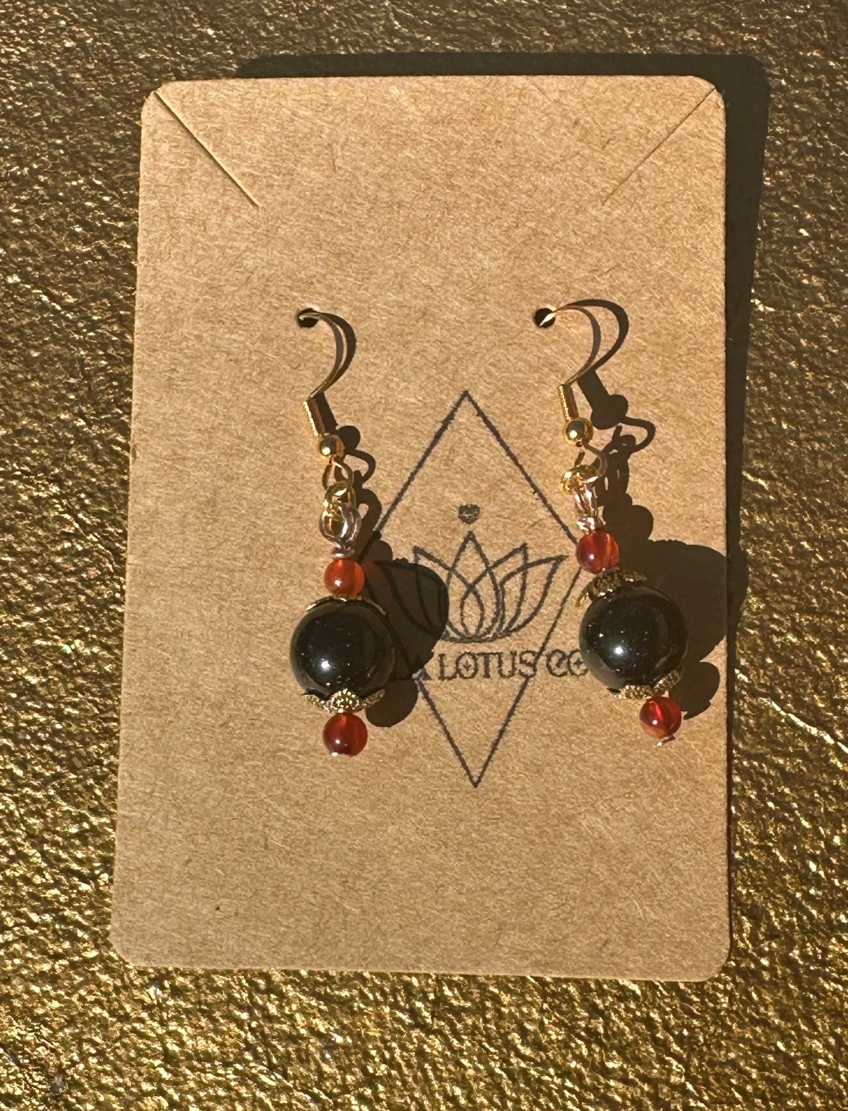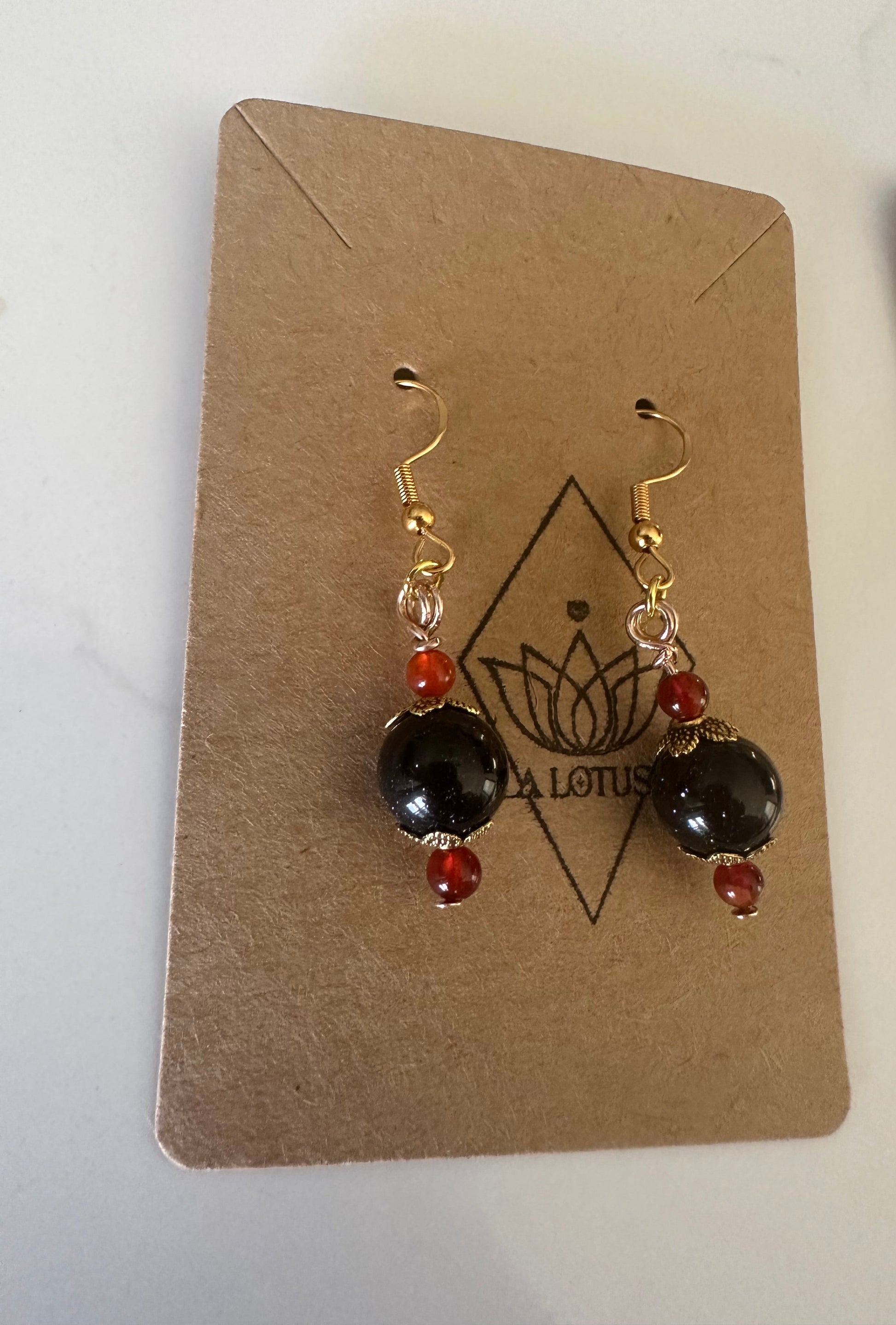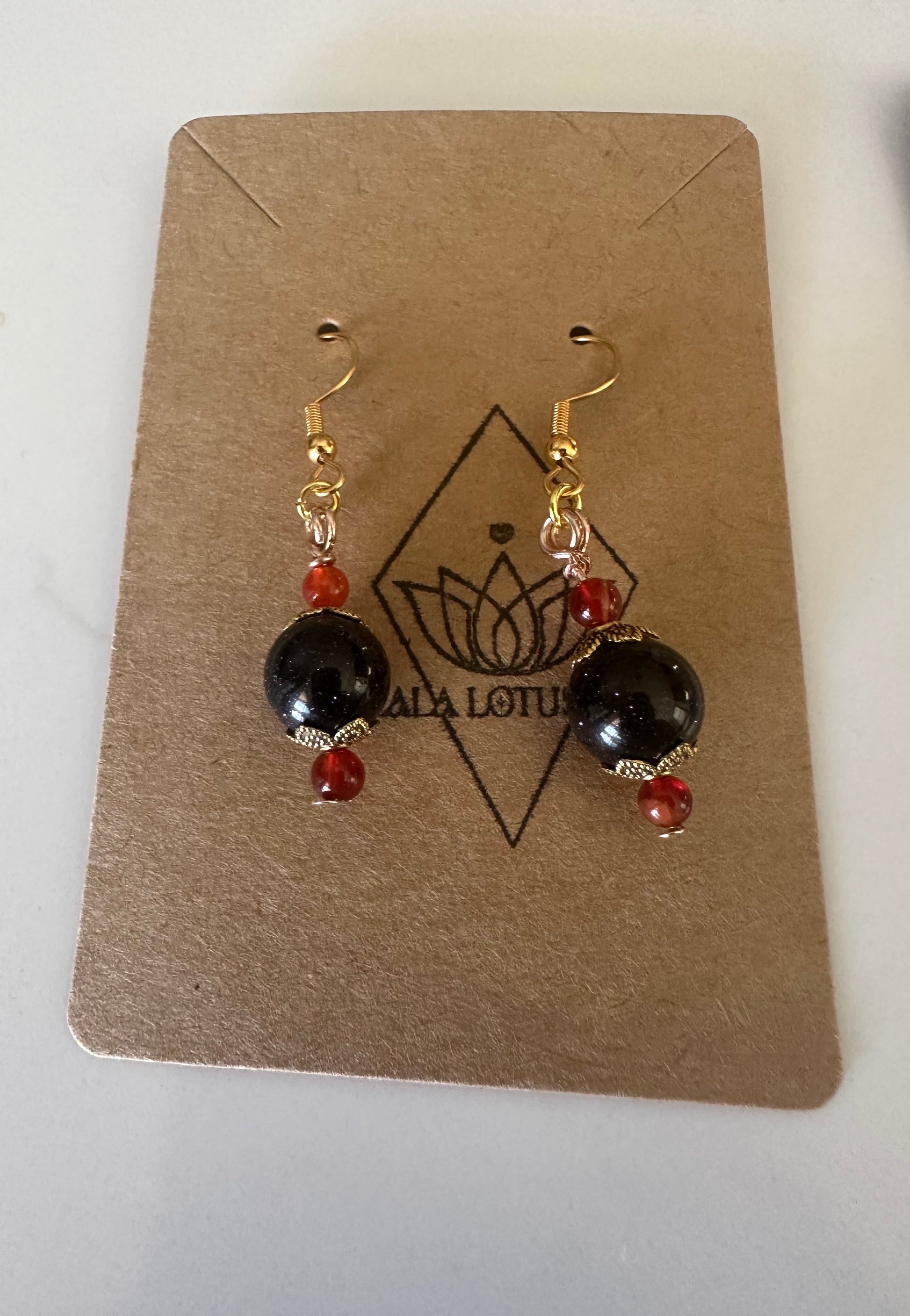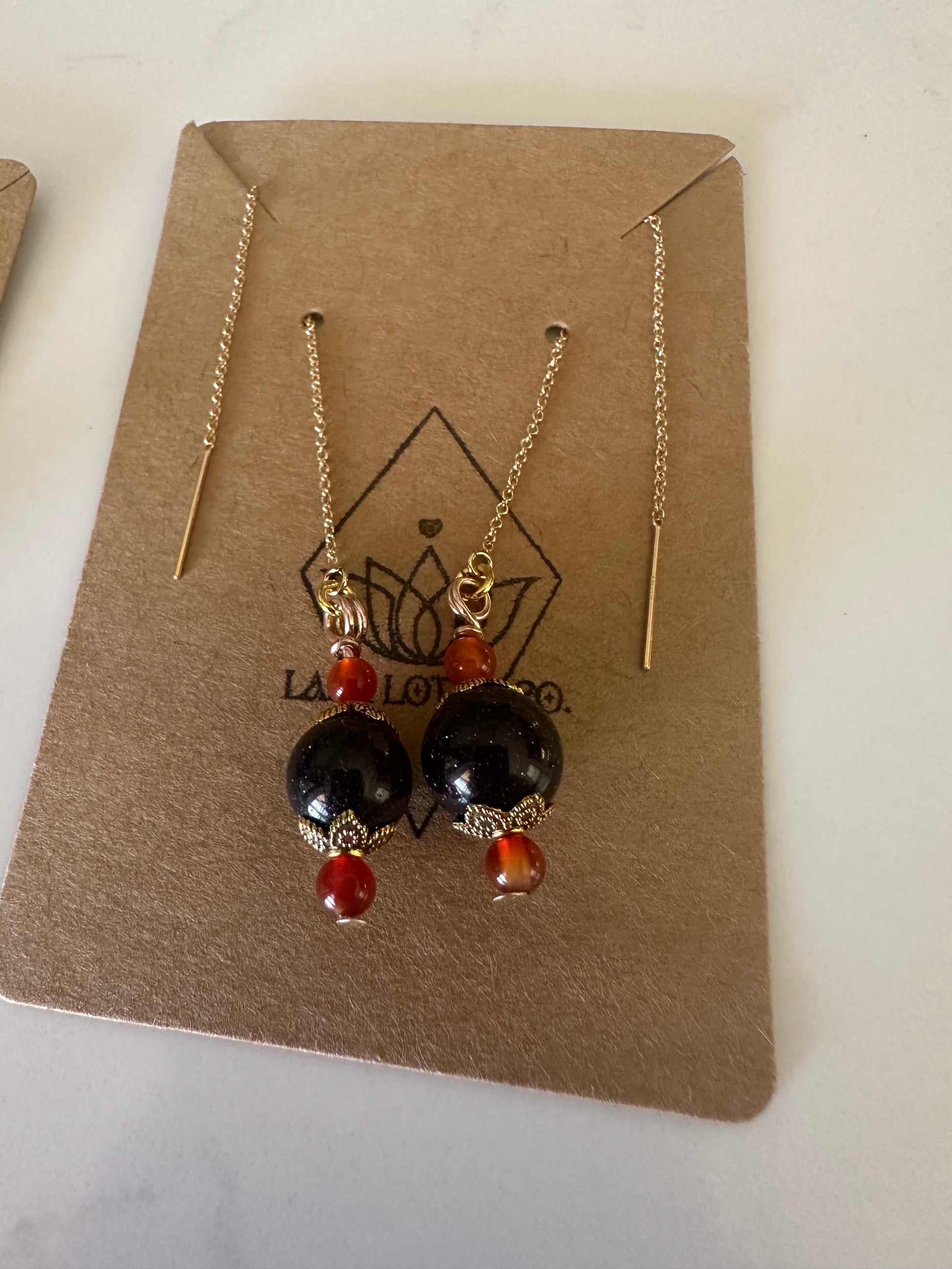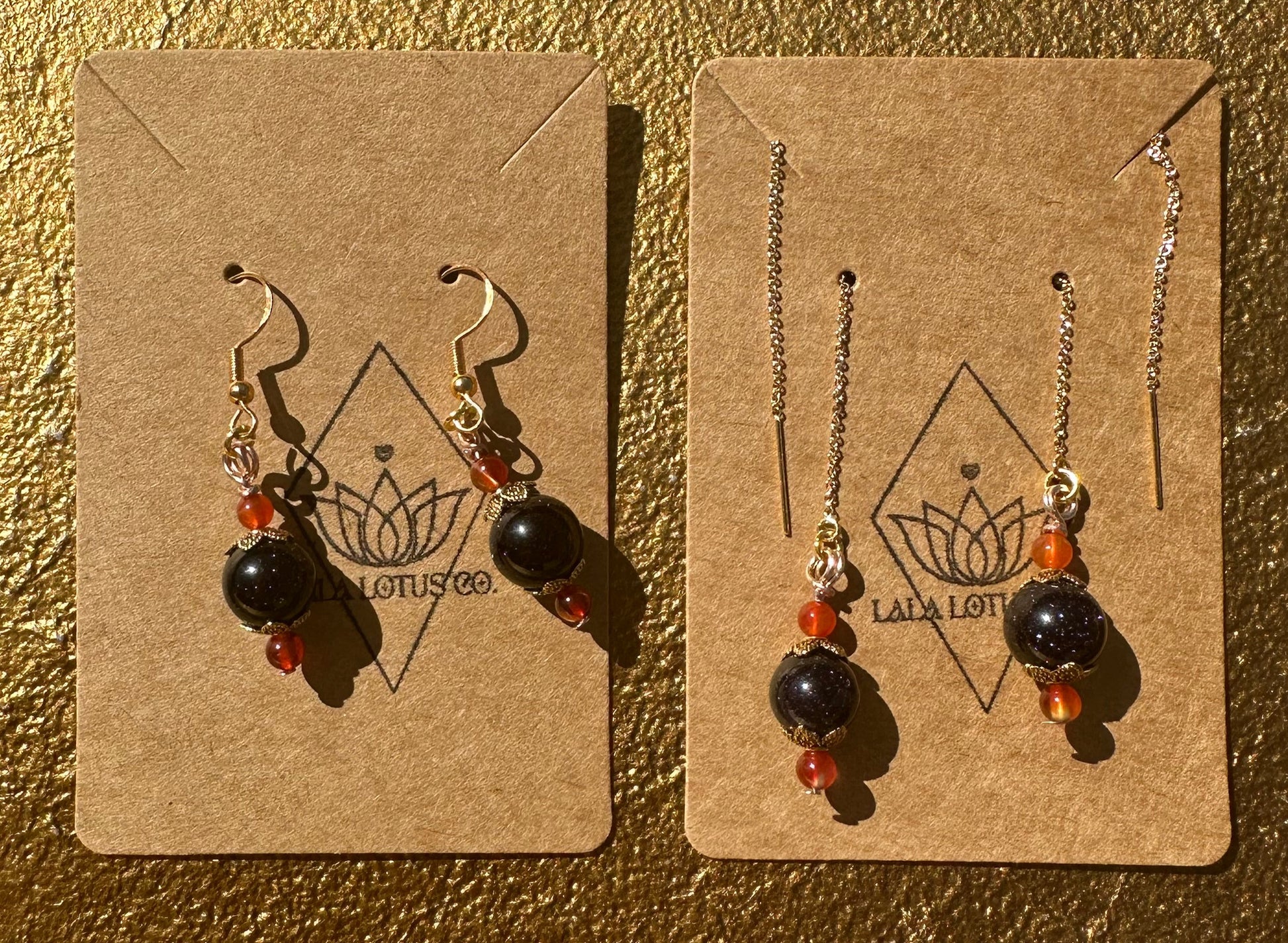 Discover the exquisite Twilight Lantern Earrings, crafted in collaboration with Ghost Guide Rebekah. These stunning earrings are handcrafted and blessed with Reiki, featuring Blue Goldstone and Carnelian designs. Choose between the shorter dangle style (about 1 inch) or the adjustable 4-inch threader design. Note that the longer earrings may feel heavier for some.