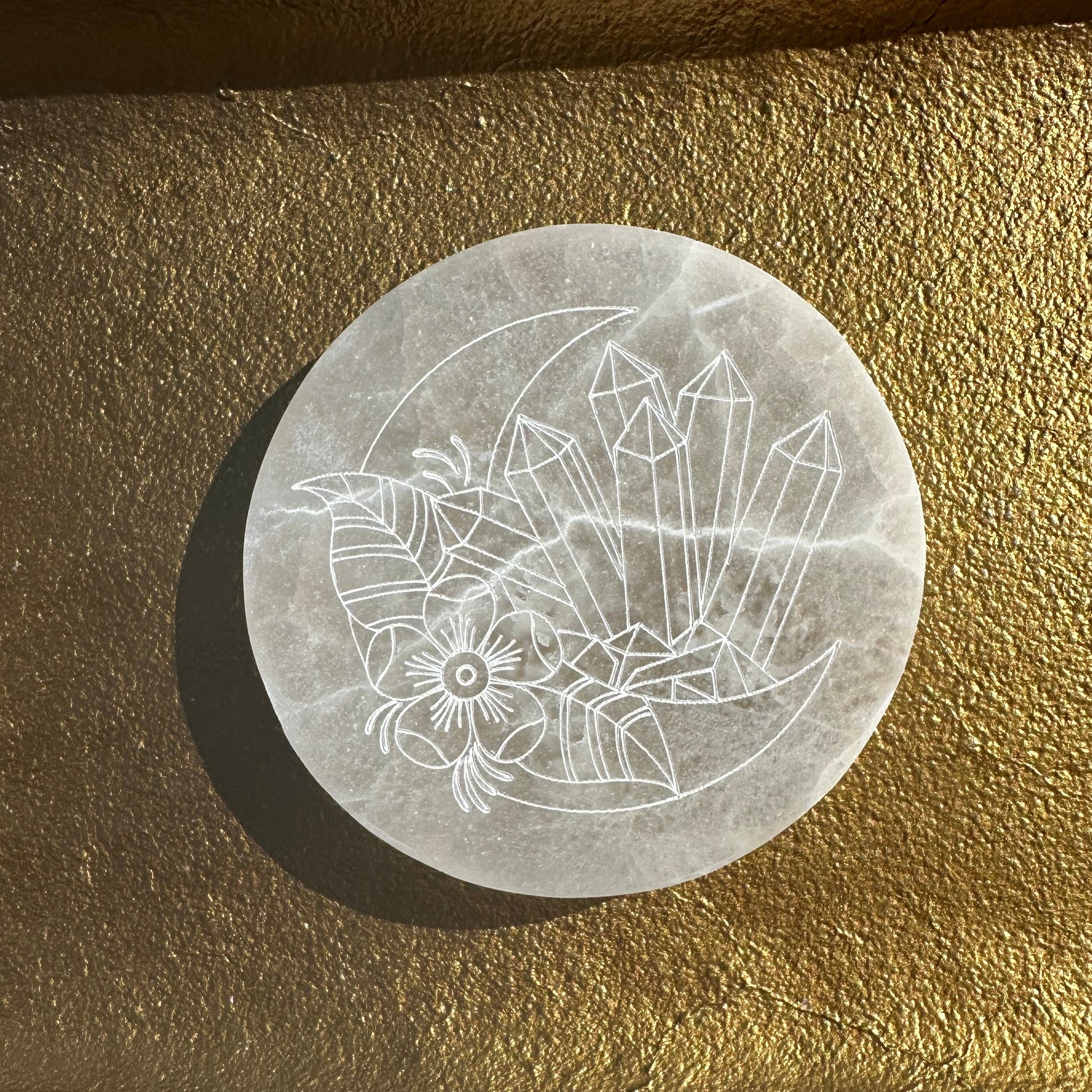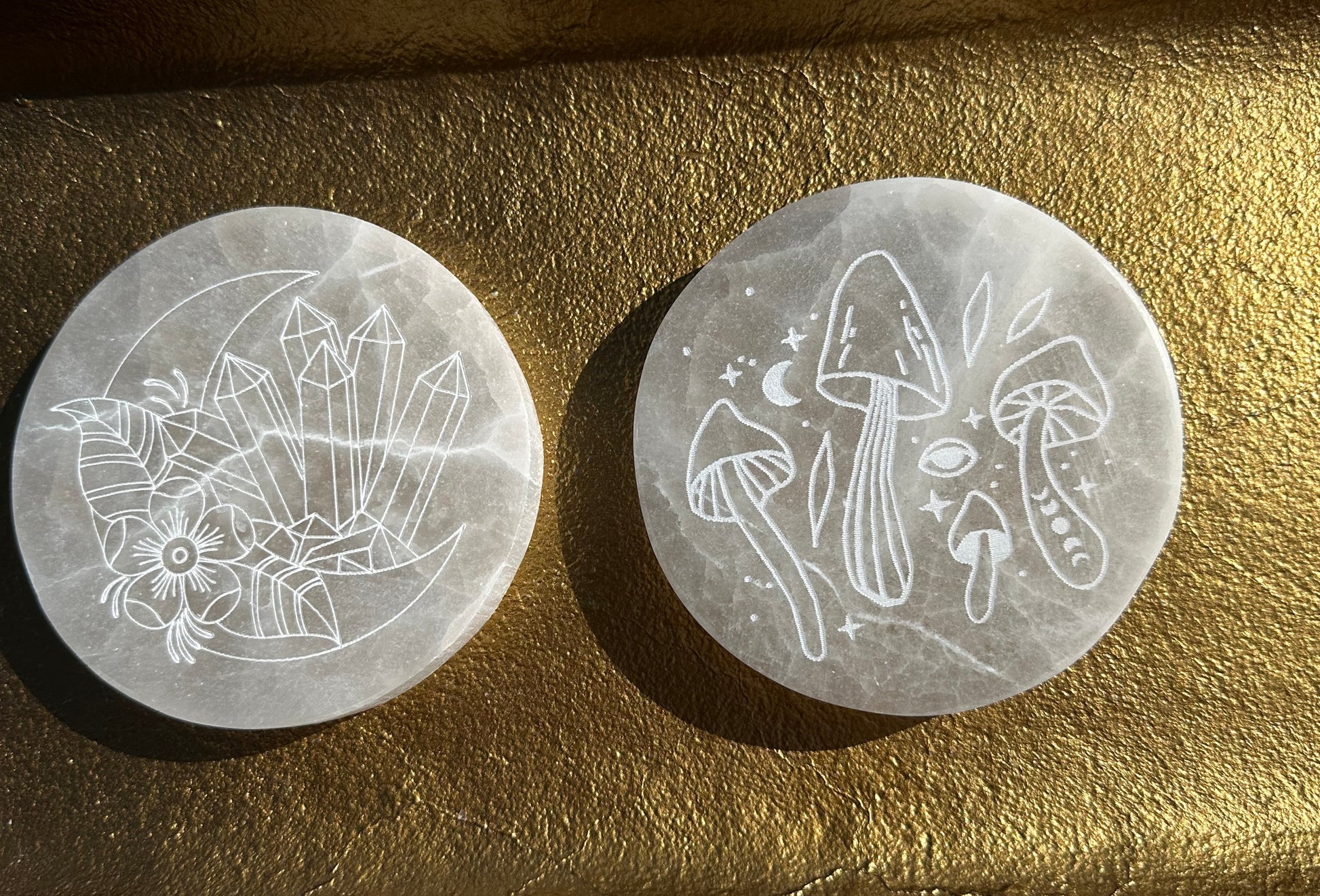 This listing includes one Whimsical Etched Selenite Plate, available in your choice of either a moon and crystal etching or a playful mushroom motif.